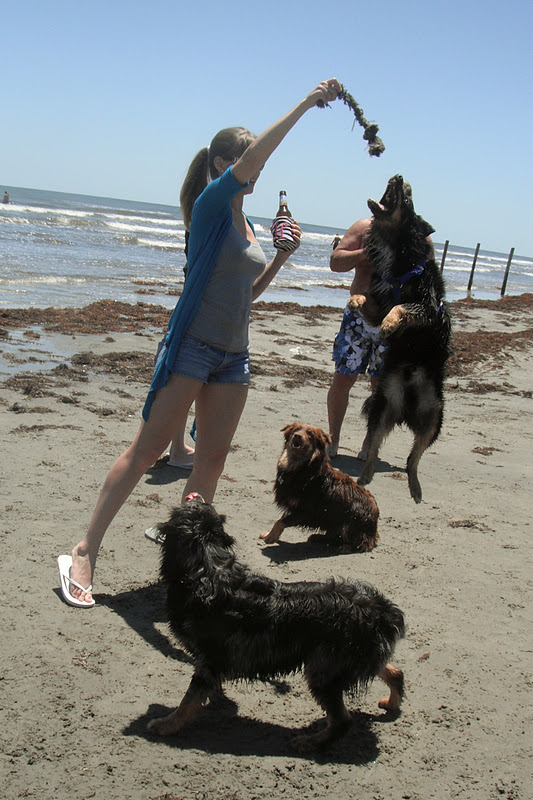 | Henry playing with the three Australian Shepherds at the beach in Galveston, Texas. Howdy has the market on jumping ability. |