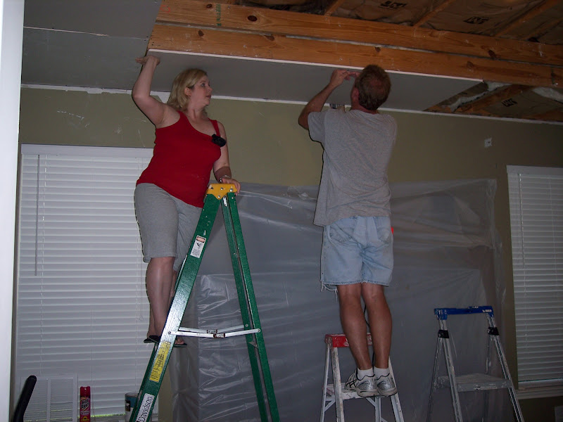 We struggled through these two years while trying to go through the legal system to get the insurance company to pay the agreed upon settlement. It was certainly a time of building character. During that time, there were still gatherings at our house, even though we had plastic sheeting hanging down our walls, stapled to the 2x4's instead of sheetrock. We didn't have any flooring in several rooms, just plywood upstairs and downstairs, in the areas not already tiled, we had the foundation concrete exposed that was splattered with the construction paint, etc., from the time the house had been built. It wasn't pretty, but at least we had a roof over our head.